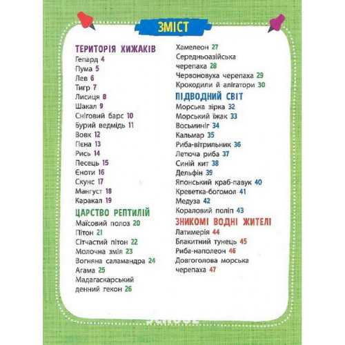 Мініенциклопедія. Тваринний світ 978-966-982-726-5 Дитяча мініенциклопедія про тварин — чудовий подарунок для всіх, хто хоче поринути в загадковий світ цих істот. Юні читачі дізнаються чимало фактів про середовище існування та спосіб життя хижаків, рептилій і мешканців підводного світу. Завдяки яскравим зображенням можна детальніше розглянути особливості будови дивовижних тварин.