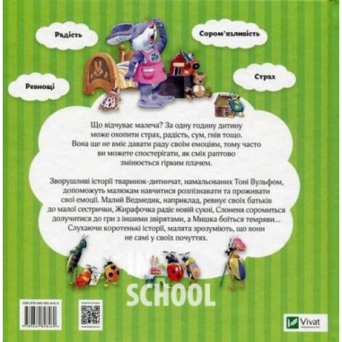 Мої перші емоції., Анналіза Лей 978-966-982-846-0 Зворушливі історії тваринок-дитинчат, намальованих Тоні Вульфом, допоможуть малюкам навчитися розпізнавати та проживати свої емоції. Малий Ведмедик, наприклад, ревнує своїх батьків до малої сестрички, Жирафочка радіє новій сукні, Слоненя соромиться долучитися до гри з іншими звірятами, а Мишка боїться темряви.Слухаючи коротенькі історії, малята зрозуміють, що вони не самі у своїх почуттях.