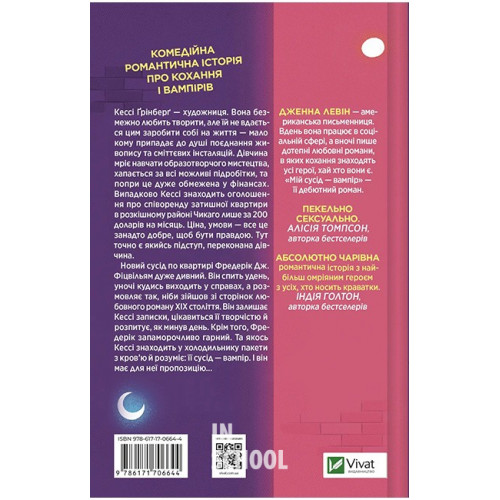 Мої вампіри. Книга 1. Мій сусід - вампір., Дженна Левін 978-617-17-0664-4 Кессі Ґрінберґ — художниця. Вона безмежно любить творити, але їй не вдається цим заробити собі на життя — мало кому припадає до душі поєднання живопису та сміттєвих інсталяцій. Дівчина мріє навчати образотворчого мистецтва, хапається за всі можливі підробітки, та попри це дуже обмежена у фінансах. Випадково Кессі знаходить оголошення про співоренду затишної квартири в розкішному районі Чикаго лише за 200 доларів на місяць. Ціна, умови — все це занадто добре, щоб бути правдою. Тут точно є якийсь підступ, переконана дівчина. Новий сусід по квартирі Фредерік Дж. Фіцвільям дуже дивний. Він спить удень, уночі кудись виходить у справах, а розмовляє так, ніби зійшов зі сторінок любовного роману ХІХ століття. Він залишає Кессі записки, цікавиться її творчістю і розпитує, як минув день. Крім того, Фредерік запаморочливо гарний. Та якось Кессі знаходить у холодильнику пакети з кров’ю і розуміє: її сусід — вампір. І він має для неї пропозицію…