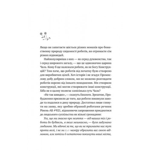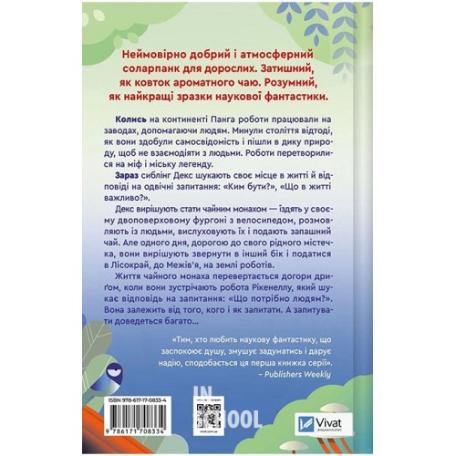 Монах і робот. Книга 1. Псалом для дикостворених., Бекі Чемберс 978-617-17-0833-4 Колись на континенті Панга роботи працювали на заводах, допомагаючи людям. Минули століття відтоді, як вони здобули самосвідомість і пішли в дику природу, щоб не взаємодіяти з людьми. Роботи перетворилися на міф і міську легенду. Зараз сиблінг Декс шукають своє місце в житті й відповіді на одвічні запитання: «Ким бути?», «Що в житті важливо?». Декс вирішують стати чайним монахом — їздять у своєму двоповерховому фургоні з велосипедом, розмовляють із людьми, вислуховують їх і подають запашний чай. Але одного дня, дорогою до свого рідного містечка, вони вирішують звернути в інший бік і податися в Лісокрай, до Межів’я, на землі роботів. Життя чайного монаха перевертається догори дриґом, коли вони зустрічають робота Рікенеллу, який шукає відповідь на запитання: «Що потрібно людям?». Вона залежить від того, кого і як запитати. А запитувати доведеться багато…