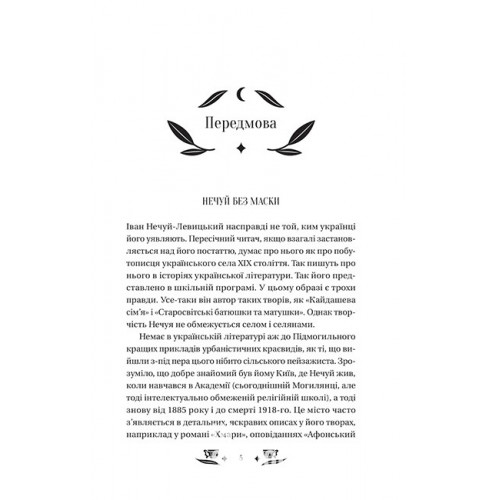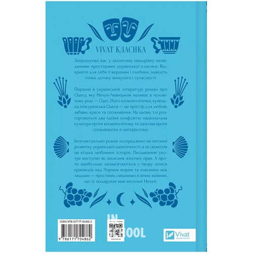 Над Чорним морем /зі зрізом/., Нечуй-Левицький I. 978-617-17-0486-2 Перший в українській літературі роман про Одесу, яку Нечуй-Левицький називає в чоловічому роді — Одес. И?ого космополітична, купецька, епікурейська Одеса — це простір для любові, забави, краси та споживання. На цьому тлі розгортаються два ідейні конфлікти: національна культура проти космополітизму та ідеалізм проти споживацтва й матеріалізму.Інтелектуально роман зосереджено на питанні розвитку української ідентичності, а за сюжетом це кілька любовних історій. Письменник укотре виступає як захисник жіночих прав. А проте найбільше запам’ятаються з твору описи краєвидів над Чорним морем та взаємини між людьми — простими, смішними й вічно живими, що їх подарував нам веселий Нечуй.