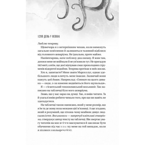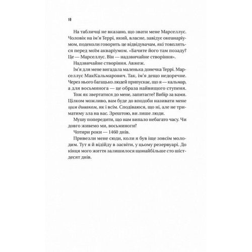 Напрочуд кмітливі створіння., Шелбі Ван Пелт 978-617-17-0523-4 Книга «Напрочуд кмітливі створіння» — це дебютний роман канадської письменниці Шелбі Ван Пелт про Тові Салліван, стару жінку, чиє життя сповнене болю. Чоловік помер, а син загадково зник ще тридцять років тому на човні. Тамуючи самотність, головна героїня влаштовується прибиральницею до океанаріума містечка Совелл-Бей. Одного дня вона рятує восьминога Марселлуса, який опинився поза акваріумом і майже помер.Това не знає, що нібито звичайний мешканець океанаріума може допомогти їй теж. Марселлус стане ключем до таємниці зникнення сина Еріка. «Як?» — запитаєтесь ви. Ох, це захоплива, сповнена доброти й особливих героїв історія, частину якої повідає читачам сам восьминіг.Історію «Напрочуд кмітливі створіння» Шелбі Ван Пелт починає так, що одразу розумієш: ця книжка дуже відрізняється від усього прочитаного раніше. Себе представляє нам Марселлус МакКальмарович. Ім’я, яким його нарекла людська дитина, восьминогу не до душі, бо бути прийнятим за кальмара — найбільша образа.Він розповідає про своє буття в акваріумі досить конкретно визначає час, який залишився в його житті як гігантського тихоокеанського восьминога — 160 днів. Він уміє рахувати і вміє читати, адже Марселлус — напрочуд кмітливе створіння. Може ще й зламувати замки й тікати з акваріума, коли ніхто не дивиться.Після ми знайомимося з сімдесятирічною Товою, яка приходить після робочого дня почистити акваріум. Одного вечора вона знаходить наше напрочуд кмітливе (й дотепне!) створіння заплутаним у зарядному шнурі. Той не може повернутися до свого резервуара, бо пізно ввечері перекусив покинутою їжею. Жінка рятує його й тримає в таємниці його нічні мандрівки. Так починається історія чудернацької дружби, яка змінить життя обох.Знаємо багато книжок про дружбу котів, собак з людьми. А от друг-восьминіг — це, напевно, літературне вперше, що точно вартує уваги. Ви могли поставитись скептично до такого розумного Марселлуса. Та чи знали ви, що восьминоги піддаються дресуванню, вміють розрізняти людей і геометричні фігури? Хто знає, може десь існує справжня Това Салліван, яка зберегла таємницю розумного створіння й подружилась з ним… Втім, перша сторінка запевняє, що всі схожості з реальністю — випадковість. Залишається читати «Remarkably Bright Creatures» Шелбі Ван Пелт і гадати, насолоджуючись цією теплою історією.