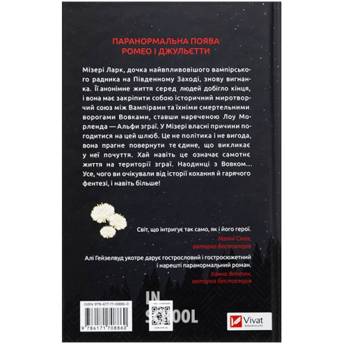 Наречена /зі зрізом/., Алі Гейзелвуд 978-617-17-0886-0 Книга «Наречена» — це Paranormal Romance від письменниці Алі Гейзелвуд. Мізері Ларк використовують як інструмент боротьби за владу. Дівчина — донька впливового, безжалісного вампіра, який входить до ради вищих істот. Можновладець планує змусити доньку взяти шлюб зі смертельним ворогом, щоб відновити мир між кланами. Головна героїня не зацікавлена в політичному альянсі, однак коли вона дізнається, хто стане її нареченим, то змінює свою думку.Майбутній чоловік головної героїні — Лоу Морленд, лідер перевертнів, і він точно знає, що відбулося з близькою подругою Мізері. Людська дівчина Серена раптово зникла, а Ларк прагне з'ясувати, хто до цього причетний. Відтак головна героїня погоджується на союз, але тільки задля того, щоб бути ближче до потенційного злочинця й провести розслідування…