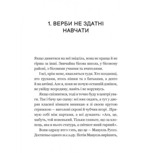 Один проти всіх., Даніела Колоджі 978-617-17-0562-3 У попередній школі з Мануелем Россі всі хотіли дружити. Його завжди помічали й боялися. Нині ж проти нього цілий світ. Серед нових однокласників хлопець стає невидимим. Досі він міг робити боляче іншим. Тепер йому щодня роблять боляче інші. Адже немає нічого гіршого від самотності, коли тобі чотирнадцять і ти прагнеш запалювати серця. Мануель складає амбітний план. Та замість «прицілитися, влучити, потопити» тутешніх учнів — із ганьбою сідає в калюжу. А те, що відбувається в цій школі… скидається на театралізовану виставу для одного глядача.