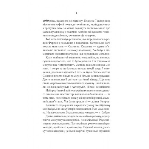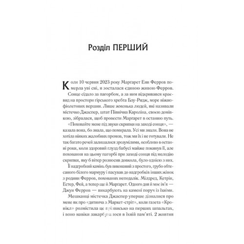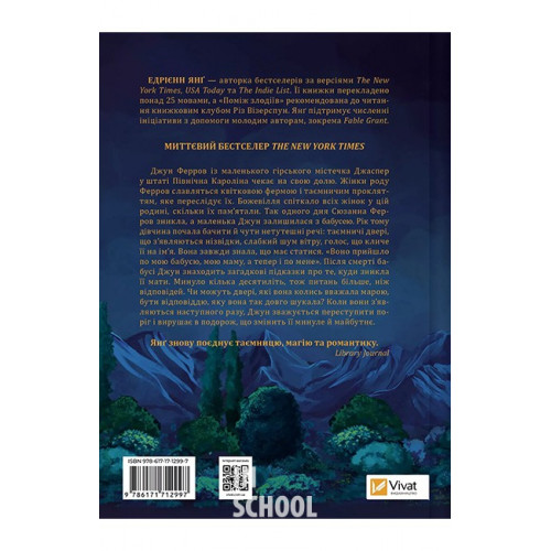 Переродження Джун Ферров., Едрієнн Янґ 978-617-17-1299-7 Джун Ферров із маленького гірського містечка Джаспер у штаті Північна Кароліна чекає на свою долю. Жінки роду Ферров славляться квітковою фермою і таємничим прокляттям, яке переслідує їх. Божевілля спіткало всіх жінок у цій родині, скільки їх пам’ятали. Так одного дня Сюзанна Ферров зникла, а маленька Джун залишилася з бабусею. Рік тому дівчина почала бачити й чути нетутешні речі: таємничі двері, що з’являються нізвідки, слабкий шум вітру, голос, що кличе її на ім’я. Вона завжди знала, що має статися. «Воно прийшло по мою бабусю, мою маму, а тепер і по мене». Після смерті бабусі Джун знаходить загадкові підказки про те, куди зникла її мати. Минуло кілька десятиліть, тож питань більше, ніж відповідей. Чи можуть двері, які вона колись вважала марою, бути відповіддю, яку вона так довго шукала? Коли вони з’являються наступного разу, Джун зважується переступити поріг і вирушає в подорож, що змінить її минуле й майбутнє.