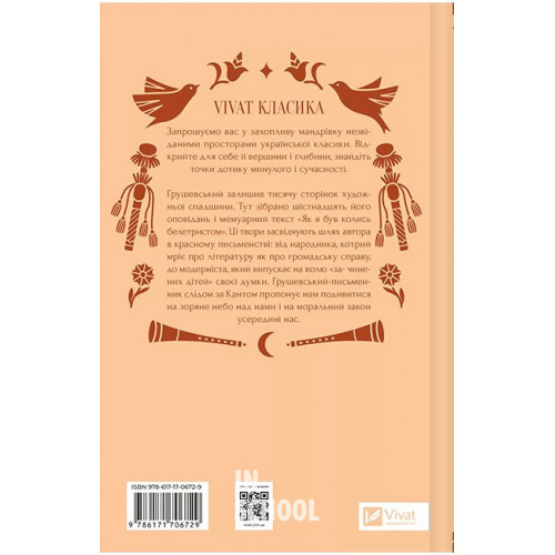 Під зоряним небом /зі зрізом/., Михайло Грушевський 978-617-17-0672-9 Грушевський залишив тисячу сторінок художньої спадщини. Тут зібрано шістнадцять його оповідань і мемуарний текст «Як я був колись белетристом». Ці твори засвідчують шлях автора в красному письменстві: від народника, котрий мріє про літературу як про громадську справу, до модерніста, який випускає на волю «зачинених дітей» своєї думки. Грушевський-письменник слідом за Кантом пропонує нам подивитися на зоряне небо над нами і на моральний закон усередині нас.