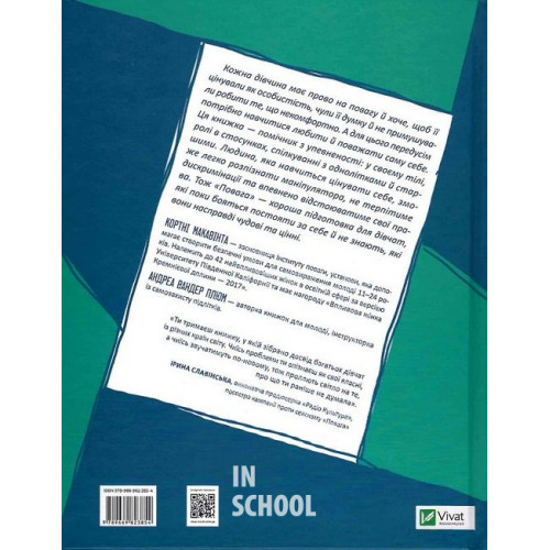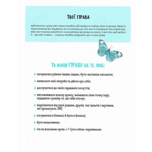 Повага: як діяти, коли зазіхають на твої особисті кордони., Кортні Макавінта, Андреа Вандер Плюм 978-966-982-385-4 Кожна дівчина має право на повагу й хоче, щоб її цінували як особистість, чули її думку й не примушували роботи те, що некомфортно. А для цього передусім потрібно навчитися любити й поважати саму себе. Ця книжка — помічник з упевненості в собі: у своєму тілі, ролі у стосунках, спілкуванні з однолітками й старшими. Людина, яка навчиться цінувати себе, зможе легко розпізнати маніпулятора, не терпітиме дискримінації та впевнено відстоюватиме свої права. Тож «Повага» — хороша підготовка для дівчат, які поки бояться постояти за себе й не знають, які вони насправді чудові й цінні.