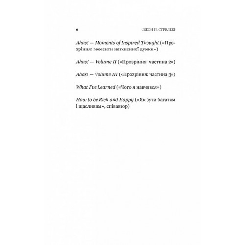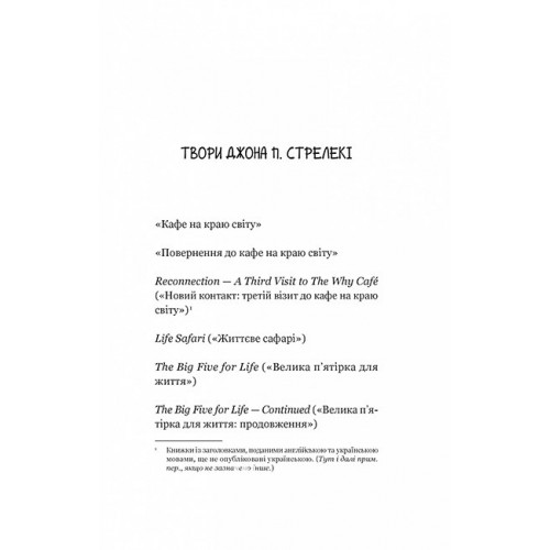 Повернення до кафе на краю світу., Джон П. Стрелекі 978-966-982-246-8 Життя Джона назавжди змінилося після того, як він заблукав і потрапив у маленьке затишне кафе «Чому ви тут?». Чоловік провів там усю ніч і полишив це місце з новим поглядом на сенс буття загалом і на своє життя зокрема. Джон дуже здивувався, коли десятьма роками пізніше знову опинився в цьому кафе. От тільки цього разу в меню були три нові запитання. І відповісти на них уже мала Джессіка — випадкова відвідувачка, яка втратила життєвий орієнтир. Час, проведений у кафе, надихає Джона і Джессіку заглибитись у себе, звіритись зі своїми цінностями й жити справжнім та насиченим життям. Події, описані в цій книжці, повертають читачів у те місце, де завжди є смачна їжа і де ставлять запитання, які спонукають замислитися про найважливіше. Тож улаштовуйтеся зручніше й насолоджуйтеся поверненням до кафе на краю світу.