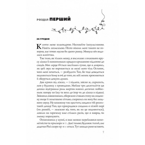 Різдвяні кружляння., Крістіна Лорен 978-617-17-0718-4 Мейлін Джонс мешкає з батьками, ненавидить свою роботу, в особистому житті — хаос і помилки. А найгірше те, що цьогоріч її родина востаннє відзначає Різдво в найкращому місці на світі — зимовій хижці у штаті Юта. Тут Мей змалку проводила свята з друзями сім’ї та їхніми синами Ендрю і Тео, але тепер ті в скруті й мусять продати хижку. Доходить кінця маленька епоха, і від цього безмежно сумно.Повертаючись додому машиною, дівчина подумки благає всесвіт показати, що може зробити її щасливою. Аж раптом автомобіль вдаряють збоку — скрип металу, тріск скла — і все поглинає темрява. Мейлін розплющує очі в літаку на шляху до Юти. Далі катастрофи одна за одною повертають її до літака. Живучи в різдвяному «дні бабака», дівчина повинна з’ясувати, як вийти з цієї часової петлі, і заразом знайти своє справжнє кохання.