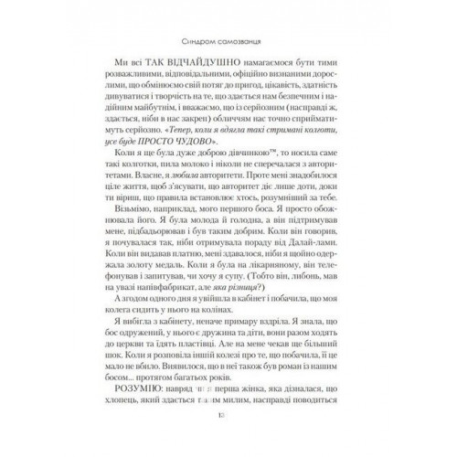Синдром самозванця. Як прожити неймовірне життя, на яке ви заслуговуєте., Амбірдж Е. 978-966-982-936-8 Утомилися від відчуття застою, від неспокою, порожнечі й заціпеніння в кар’єрі та в житті? То хапайте сірники — нумо запалювати! Зразу довіримося своїм найнебезпечнішим ідеям, дізнаємося правду про «пошук своєї пристрасті» та істинну причину того, чому так багато людей намагаються зрозуміти, що хотіли б робити зі своїм єдиним нудним і нестерпно похмурим існуванням, і усміхаються лише для світлин, вимовляючи «си-и-ир». До речі, про світлини: у світі ще не достатньо фотографів, дизайнерів, художників тощо, адже ніхто не вичаровуватиме щось так, як ви. Ви довідаєтеся, як будь-які знання, якими володієте, перетворити на роботу мрії, чому не варто починати з малого і як оговтатися після всього, що може вам прилетіти. А ще позбудетеся синдрому самозванця в усіх його проявах, зокрема й щодо грошей. Непристойно великих грошей, які сунутимуть до вас лавою.
