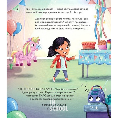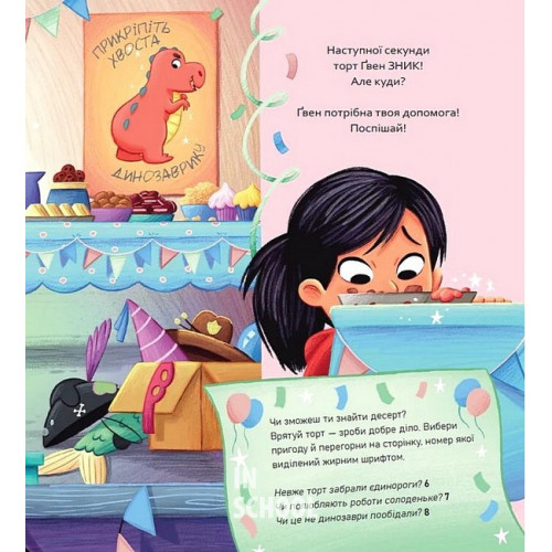 Вибери пригоду: Пірати + Прибульці + Джунглі / Динозаври + Єдинороги + Роботи., Сара Койл 978-617-17-0698-9 Дитяча ілюстрована книжка веде стежками двох квестів — «Вибери пригоду: Пірати + Прибульці + Джунглі» та «Вибери пригоду: Динозаври + Єдинороги + Роботи», в яких авторка Сара Койл і художник Адам Вокер-Паркер розгортають непересічні сюжети. У цих історіях вибір змінює хід подій, а читачі самостійно вершать долі героїв.Такі квест-пригоди заохочують використовувати уяву й брати активну роль у створенні історії, адже саме від читачів залежить, чи відшукає Ґвен свій торт на день народження і зможе малий Вінстон врятувати песика Халепку з піратського корабля.Ґвен нетерпляче очікує початку свого дня народження. Батько вирішив порадувати доньку, приготувавши апетитний святковий торт і прикрасивши помешкання, в якому пройде костюмована вечірка. Утім, починає відбуватися щось дивне — і дівча чує химерний гамір… Це єдинороги поцупили десерт і вже ласують ним? Або ж винуватців слід шукати у місті роботів? Можливо, динозаври відчули смакоту й викрали на своє застілля? Тільки читачам вирішувати, куди рушати на пошуки та як долати різноманітні виклики.Крім прямого впливу на хід сюжету, авторка пропонує різноманітний інтерактивний досвід із книжкою та приховує розваги чи не на кожній сторінці. З історіями точно не засумувати: читачі доєднаються до пошуків шести тіар, опиняться у світі роботів і обиратимуть найсмачніший торт із чудернацького меню єдинорогів!