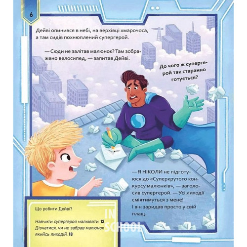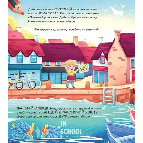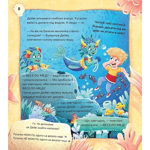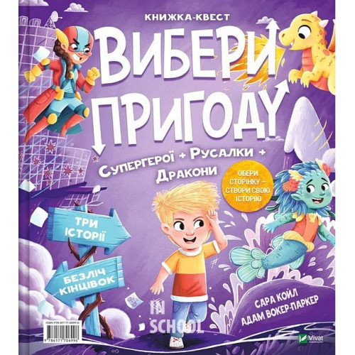 Вибери пригоду: Супергерої + Русалки + Дракони / Монстри + Принцеси + Акули., Сара Койл 978-617-17-0699-6 Ілюстрована книжка-квест поєднує дві інтерактивні пригоди — «Супергерої + Русалки + Дракони» й «Монстри + Принцеси + Акули», — з якими читачі рушають у неймовірні фантастичні світи, де можуть самостійно обирати сюжет і ухвалювати рішення.Авторка Сара Койл та ілюстратор Адам Вокер-Паркер розгортають дві дотепні історії про надзвичайно творчого хлопчика Дейві, що загубив свій малюнок, і дівчинку Зару, ведмедика якої викрали. Тільки читачі можуть врятувати дітлахів із біди, а для цього треба рушити у подорож трьома чудернацькими світами…Це був звичайний день для талановитого Дейві. Він із радістю поспішав до школи, адже для завдання «Покажи й розкажи» намалював надзвичайно крутецький велосипед, зовсім як справжній! Раптом буденний маршрут виявився повним несподіванок. Поблизу відчувалися чари русалок, драконячий хвіст виднівся на стовбурі дерева, а в небі з'явився супергерой! Важко не задивитись на таку чудасію, а тому Дейві розглядав все навколо й рисунок кудись зник.Хто ж забрав собі малюнок хлопчика? Русалонькам закортіло мати красу дитячого мистецтва у водних глибинах? Можливо, дракони вшановують талант Дейві, а що як справжнісінький супергерой братиме «велосипед» героя в найнебезпечніші місії?Радимо купити книгу «Вибери пригоду: Супергерої + Русалки + Дракони / Монстри + Принцеси + Акули» та вирушити на пошуки, в яких читачі керують детективним маршрутом і занурюються у химерні світи.