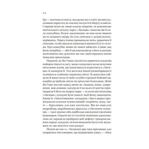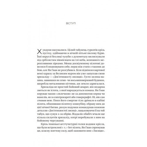 Залізна Вдова 978-617-17-0277-6 Коли сестра вісімнадцятирічної Ву Дзетянь гине, вона вирішує помститися, тому йде до лав армії, що боронить світ від космічних загарбників. Хризаліда, тобто бойова машина під назвою «Дев’ятихвоста лисиця», підпорядковується їй — і в Дзетянь прокидається сила, що стрясає землю. Отже, тепер їй до снаги не просто помста, а ще й цілковитий бунт проти всієї зашкарублої системи суспільства. Що буде, коли її, Залізну Вдову, примусять працювати з Лі Шимінем, Залізним Демоном і пілотом «Жар-птаха»? Дзетянь має з’ясувати, чому пілотна система передбачає позбавлення життєвої енергії саме жінок і чому чоловіки бояться їх навіть більше, ніж ворожих хундунів.Фентезі та фемінізм — чим не цікава формула? Саме ця книжка використовує її якнайкраще, дорогою вплітаючи ще й східні мотиви. Така принадна екзотика не залишилася непоміченою читачами по всьому світу — близько 70 000 оцінок (майже половина з них 5 зірок) та 15 000 відгуків на Goodreads підтверджують це.Молоді авторки вже знають усі канони жанру, майстерно жонглюють ними в оповіді, але роблять свій текст більш свіжим та близьким сучасному читачеві. Саме тому книжка ніколи не викликає ефекту дежавю, сюжетні ходи дивують масштабом вигадки, і персонажі здаються не обраними супергероями, а живими вразливими людьми з психологічними проблемами і негативними рисами.