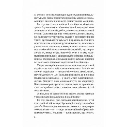 Записки зі страти., Даня Кукафка 978-617-17-0592-0 Енсела Пакера, серійного вбивцю, стратять за дванадцять годин. Капелан порадив йому прийняти те, що неможливо змінити. Але зворотний відлік — найскладніша частина покарання, хай навіть заслуженого. Яким було життя Енсела? Чи є йому за ким шкодувати?Історію чоловіка розкажуть три жінки. Лаванда, яка не знала, що материнство може бути таким жорстоким і що її син виросте монстром. Детективка Шеффі, яка поклала всі свої сили на боротьбу за справедливість. Сестра-близнючка в жалобі. Йдеться не про злочинця, образ якого намагається романтизувати суспільство, а про отруйну систему правосуддя, нищівну доброту, складність людського життя. Та про сильних жінок, що здатні на більше.