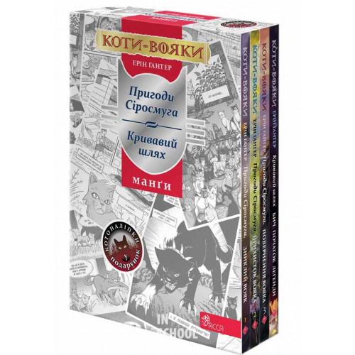 Коти-вояки. Манґа. Подарунковий комплект, Ерін Гантер 978-617-8229-11-5 До спеціального подарункового комплекту «Коти-Вояки» входить: Чотири манґи з серії «Коти-вояки»: «Пригоди Сіросмуга. Зниклий вояк»; «Пригоди Сіросмуга. Прихисток вояка»; «Пригоди Сіросмуга. Повернення вояка» та «Кривавий шлях. Бич. Початок легенди».