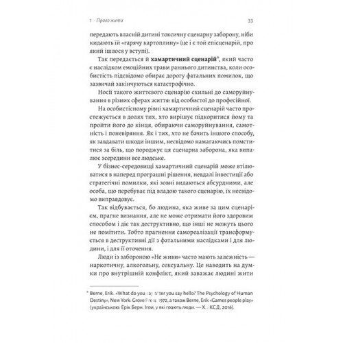 Чи ви помічали як часто думаєте «не судилося», «це просто прокляття» чи «мені ніколи не вдасться»? Спираючись на теорії транзакційного аналізу й багаторічний професійний досвід, психотерапевтка Марія Фабрічева пояснює, що такі думки швидше за все зумовлені життєвим сценарієм і психологічними заборонами, засвоєними ще в ранньому дитинстві. Також авторка демонструє, як історичні події XX століття, зокрема сталінський терор, вплинули на формування цих заборон на культуральному рівні, аналізує, як ці заборони вплинули на систему виховання та соціальні норми та досі обмежують наше мислення і поведінку.