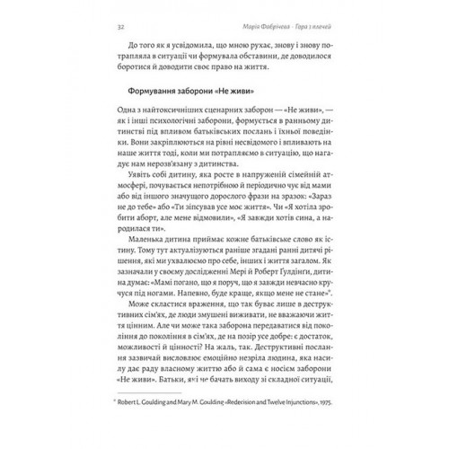 Проте психологічні заборони — це не вирок. «Гора з плечей. Як виявити і подолати 13 психологічних заборон», наповнена конкретними порадами і вправами, надихає взяти відповідальність за своє сьогодення, активізувати внутрішні ресурси і наважитися врешті скинути ту важку гору з плечей.