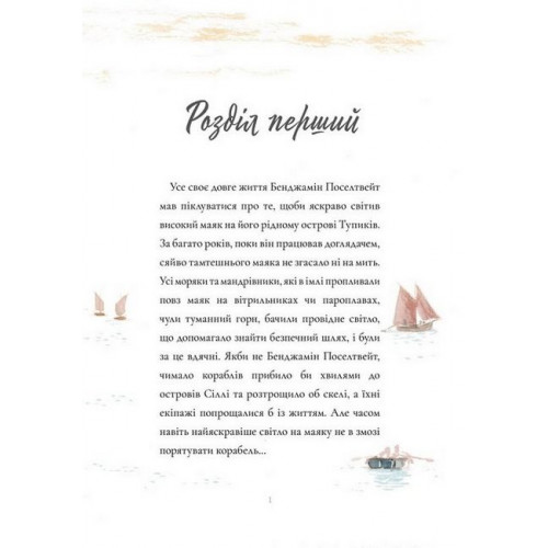 Читаріум Доглядач маяка., Майкл Морпурґо 978-617-7329-78-6 Сюжет книги розповідає про Бенджаміна, який все своє довге життя працював над тим, щоб світло в маяку на острові сяяло завжди. Жодного разу за всі роки роботи доглядачем маяка він не дозволяв світлу згаснути. Але іноді навіть найяскравіше світло на маяку не може врятувати корабель, який розбивається під час шторму. Та катастрофа несе не лише проблеми, а стає приводом для знайомства доглядача маяка з маленьким хлопчиком, життя якого буде наповнене неймовірними поворотами, цікавими подіями у навчанні, художнім натхненням і пошуками себе.