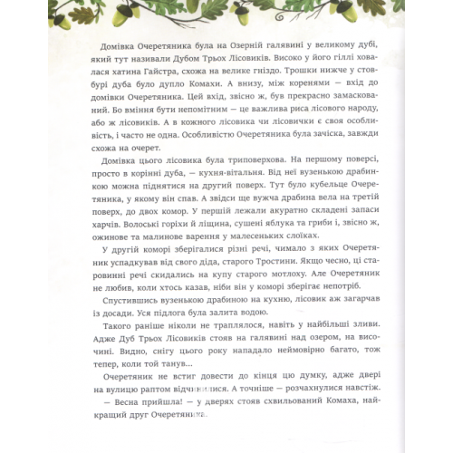Читаріум Дуб трьох лісовиків., Ткачук Галина 978-617-7329-89-2 На лісовій галявині біля озера стоїть дуб. Настає весна — життя прокидається у всьому лісі, і в нашому дубі зокрема. Це не просто могутнє дерево з великою кроною. У ньому домівка трьох друзів-лісовиків: Очеретяника, Комахи і Гайстра. Вони піклуються про ліс, товаришують з його мешканцями, пораються зі своїми лісовими справами і влаштовують великі свята. Саме зараз лісовики прокидаються, і на них чекає рік, наповнений клопотами, казковими пригодами і новими зустрічами.