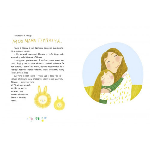 А ще — про звичайну-звичайнісіньку дівчинку, що звичайними словами розповідає про любов до своєї мами, тата, братика в маминому животику і все, що їй близьке...