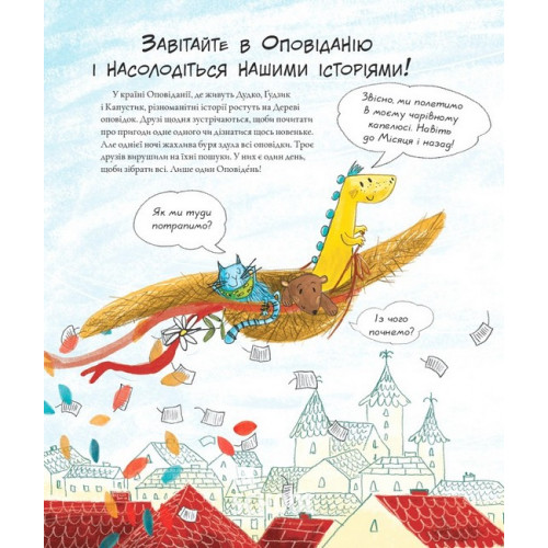 Читаріум Оповідень., Джорджі Адамс 978-617-8093-37-2 У країні Оповіданії, де живуть Дудко, Гудзик і Капустик, різноманітні історії ростуть на Дереві оповідок. Друзі щодня зустрічаються, щоби почитати про пригоди одне одного чи дізнатися щось новеньке. Але однієї ночі жахлива буря здула всі оповідки. Троє друзів вирушили на їхні пошуки. У них є один Оповідень, щоби зібрати всі! Чи справляться вони з цим завданням?