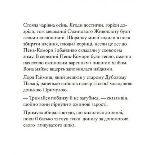 Нумо заглянемо за Ожиновий живопліт. Тут з покоління в покоління милі мишки облаштовують свої будиночки в коренях і стовбурах дерев. Вони дуже працелюбні, тому у гарну погоду збирають квіти, фрукти, ягоди та горіхи в лісі й навколишніх полях. А ще варять смачне варення, солять, маринують гриби та овочі про запас. Всі заготовляння зберігають в величенькому пеньку-коморі.