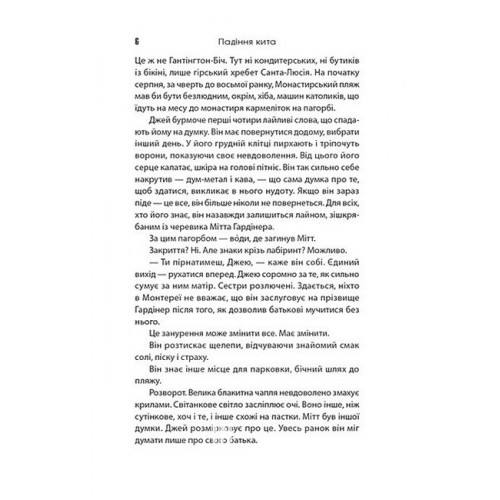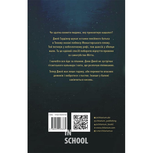 Читаріум Падіння кита., Деніел Краус 978-617-8093-78-5 Джей Гардінер шукає останки покійного батька в Тихому океані поблизу Монастирського пляжу. Той потонув у небезпечному рифі, тож шансів у хлопця мало. Та це єдиний спосіб побороти відчуття провини за самогубство Мітта.