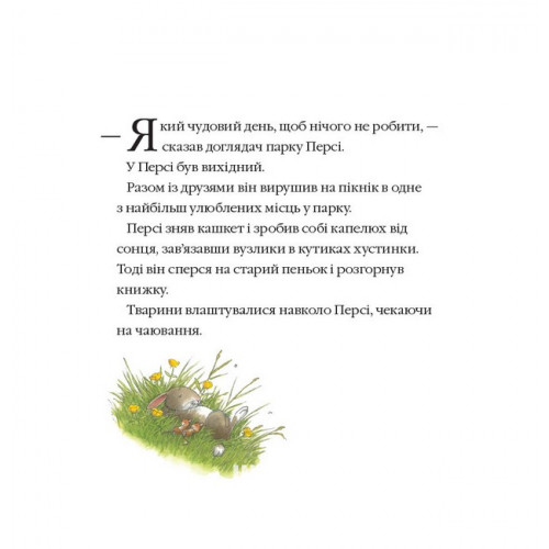 Читаріум Рятівний загін. Історії парку Персі., Нік Баттерворт 978-617-8093-61-7 Спекотного літнього дня Персі, доглядач парку, вирушає на пікнік разом зі своїми улюбленими тваринами. Всі насолоджуються миром і тишею, коли раптом маленька кроличка опиняється в старому колодязі й не може вибратися.