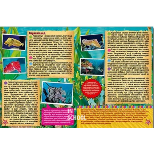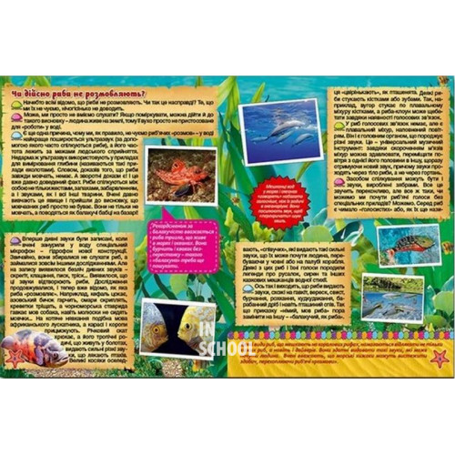 Пізнавальні тексти, незвичні факти, яскраві фотографії допоможуть юному досліднику дізнатися багато цікавого та корисного про звички підводних мешканців, їх середовище проживання, харчування, особливості полювання, захисту і багато іншого.