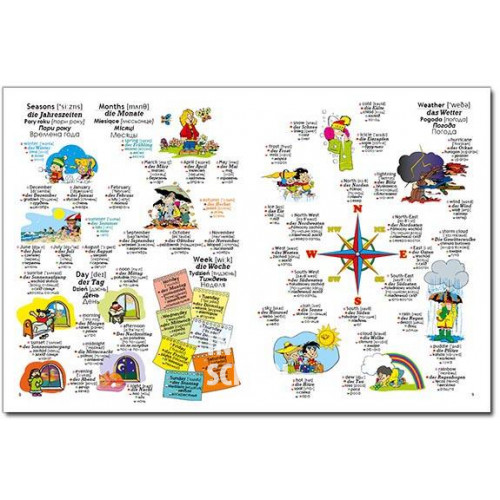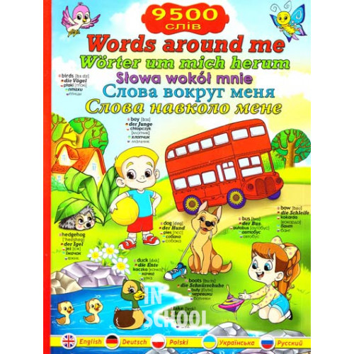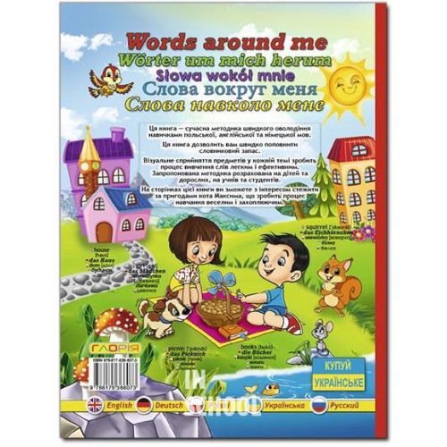 Видавництво "Глорія" Слова навколо мене., Ольга Мазур, Олег Єрошенко 978-617-536-607-3 Ця книга - сучасна методика швидкого оволодіння навичками англійської, німецької та польської мов. 60 різних тем і попаду 9500 слів, розміщених у цьому виданні, дадуть вам змогу швидко поповнити словниковий запас. Візуальне сприйняття предметів у кожній темі зробить процес вивчення слів легким і ефективним. Дана методика розрахована на маленьких та дорослих, на школярів та студентів. Для ефективного вивчення англійської та польської мов до кожного слова додається транскрипція, що дає змогу легко його прочитати. Оскільки німецька мова не має транскрипції, у книзі наведено таблицю правильного читання німецьких літер із прикладами. На сторінках цієї книги ви зможете з інтересом стежити за пригодами кота Максима, що зробить процес навчання веселим і захоплюючим.