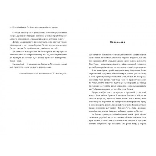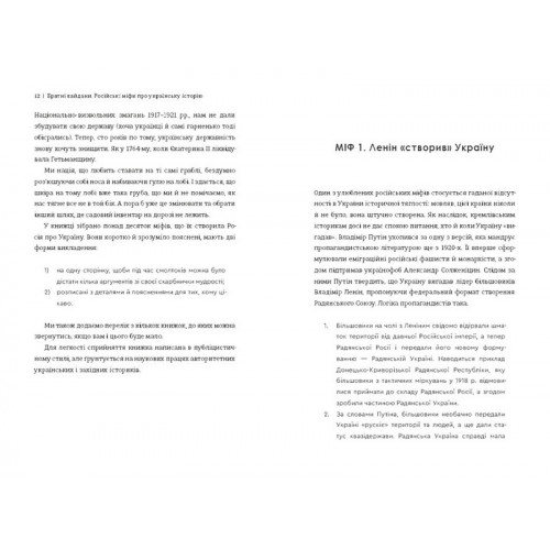 У цій книжці українські історики, автори подкасту «Без оголошення війни» Олександр Аврамчук та Ілля Кабачинський розвінчують найпопулярніші створені Росією міфи про нашу історію. Кожен розділ — один міф, пояснений спочатку лаконічно й тезово, а потім — більш детально. З допомогою наведених у тексті аргументів відповідати на провокації на кшталт «Ленін створив Україну» чи закидів про «братні народи» буде ще простіше.