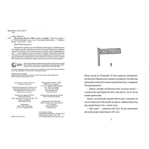 Видавництво "Книги - ХХІ" Інспектор Дилема. Щось літає у повітрі., Крістіна Андрес 978-617-614-650-6 Мешканці острівного містечка Піщане жили тихим і спокійним життям. Навіть занадто спокійним, вважав інспектор Піщанського відділку поліції Оле Дилема. Аж ось одного дня на острові стався справжній злочин — хтось підірвав касові автомати на щойно збудованій парковці. А це вже щось! Інспектор Дилема миттю застрибнув на велосипед, посадив на багажник поліцейського песика Цятку й помчав на місце злочину. Як би дивно не поводилися свідки, інспектор докопається до правди!
