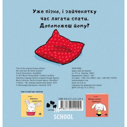 Видавництво "Книги - ХХІ" Іще почухаєш за вушком?., Йорг Мюле 978-617-614-229-4 Книжка-картонка німецького автора та ілюстратора Йорґа Мюле розпочинає серію мальованих оповідок про Зайченятко, яке обов’язково стане другом наймолодших читачів. Книжки приваблюють не лише симпатичним персонажем, приємними кольорами, а й тим, що оповідь побудована з розрахунком на інтерактив, завдяки якому Зайченятко оживає, а читання перетворюється на пізнавальну гру і спілкування.
