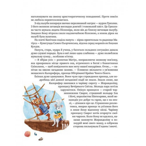Видавництво "Книги - ХХІ" Капітан Матіус в Країні Коротких Штанців., Ян Пєкло 978-617-614-344-4 Хто не любить казок про чарівні країни, де тварини говорять людським голосом, а герої борються зі злом? У своїй казці Ян Пєкло, посол Польщі в Україні у 2016–2019 роках, розповідає про пригоди відважного капітана Матіуса, який на власному вітрильнику «Онуфрій Пімпель» вирушає разом із командою на складну місію. Його мета — врятувати принца Калорифера та принцесу Жирандоліну, ув?язнених жорстоким чаклуном Сварогом. Казку варто почитати, щоб дізнатися, яка доля спіткала злого Сварога і як ці події змінили життя людей у Країні Коротких Штанців, де ніколи не світило сонце, а листя дерев ніколи не було достатньо зеленим... Мабуть, дорослі теж люблять такі казки.