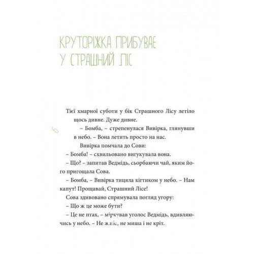 Видавництво "Книги - ХХІ" КРУТОРІЖКА У СТРАШНОМУ ЛІСІ., Яна Бауер 978-617-614-321-5 Однієї нічим не примітної суботи мешканці Страшного Лісу займалися своїми звичними справами: хтось перелічував горішки, хтось дрімав, а дехто скаржився на життя. Ані Їжак, ані Лісовий Сонь, і навіть мудра Сова не підозрювали, що до них незабаром прибуде несподівана гостя, а разом із нею – великі й маленькі пригоди, з яких народиться справжня дружба.