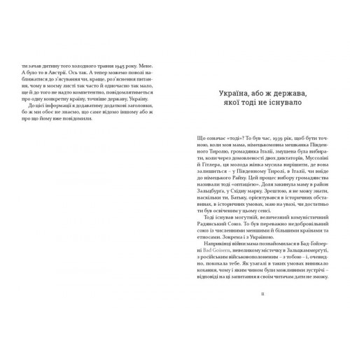 Видавництво "Книги - ХХІ" ЛИСТ В УКРАЇНУ., Вальтрауд Міттіх 978-617-614-418-2 Героїня есеїстичного роману «Лист в Україну», в якій упізнаємо риси й деталі біографії авторки, інтенсивно цікавиться Україною, маючи для цього особисті мотиви (її біологічним батьком був військовополонений офіцер родом з Києва), а водночас вбачаючи чимало паралелей між Україною та своєю батьківщиною – Південним Тиролем, автономною північно-італійською провінцією, понад 60 % населення якої вважає своєю рідною мовою німецьку. Відстежуючи асоціативні, нерідко полемічні повороти оповіді авторки, читачі зможуть збагатитися низкою типових для європейської історії сюжетів – від Середньовіччя з його видатним монархом Максиміліаном І до сучасних подій у змаганні південнотирольських діячів культури за збереження самобутньої культури регіону.