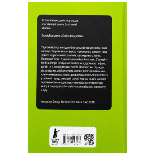 Видавництво "Книги - ХХІ" Природний роман., Ґеорґі Ґосподінов 978-617-614-700-8 Здається, ніби все почалося від звичайного плетеного крісла-гойдалки. Відколи воно з’явилося в домі головного героя, його життя невблаганно руйнується, сім’я розпадається, а на ринку поблизу він знаходить такого ж, як і він, невдаху-самітника, так само письменника, у такому самому плетеному кріслі. Ніби всього цього не досить, він представляється таким самим, як у героя, ім’ям. Героєве «я» починає розпадатися, як і все навколо — як уся реальність складних і божевільних посткомуністичних болгарських 1990-х. Але герой розпадається не на уламки, а на історії. Він стає їх колекціонером, оповідачем, поступово збираючи їх у дивний пазл, який найбільше нагадує фасеткове око мухи.