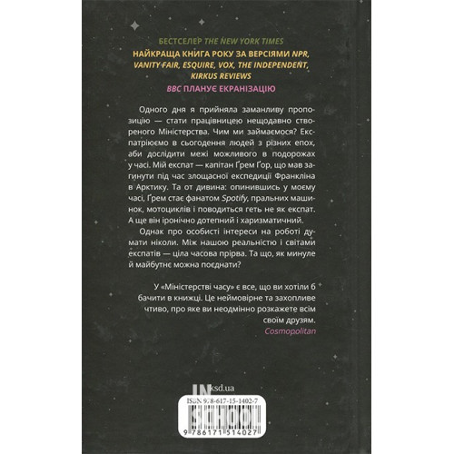 КСД Міністерство часу. - Каліан Бредлі 978-617-15-1402-7 Одного дня я прийняла заманливу пропозицію — стати співробітницею нещодавно створеного міністерства. Чим ми займаємося? Експатріюємо в сьогодення людей з різних епох, аби дослідити межі можливого в подорожах у часі. Мій експат — капітан Ґрем Ґор, що мав загинути під час злощасної експедиції Франкліна в Арктику. Та от дивина: опинившись у моєму часі Ґрем стає фанатом Spotify, пральних машинок і поводиться геть не як експат. А ще він шалено привабливий.