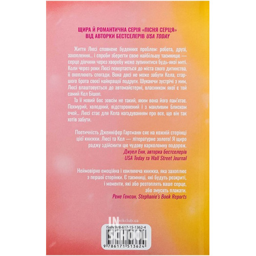 КСД Пісня серця. Посібник оптимістки з розбитого серця. Книга 1. - Дженніфер Гартманн 978-617-15-1362-4 Життя Люсі сповнене буденних проблем: робота, друзі, захоплення... і спроби зберегти свою найбільшу таємницю - серце дівчини через хворобу може зупинитися будь-якої миті. Коли через роки Люсі повертається до міста свого дитинства, її поглинають спогади. Вона досі не може забути Кела, старшого брата своєї найкращої подруги. Шукаючи нової зустрічі, Люсі влаштовується до автомайстерні, власником якої є той самий Кел Бішоп.