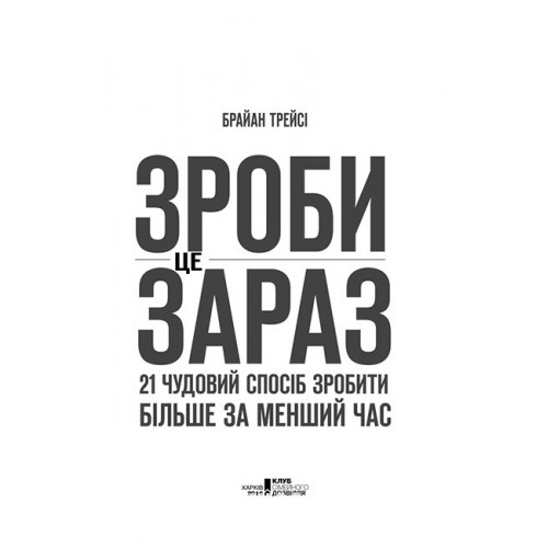 КСД Зроби це зараз. 21 чудовий спосіб зробити більше за менший час. - Брайан Трейсі 978-617-12-8621-4 Брайан Трейсі — професійний лектор, консультант, голова Brian Tracy International, мільйонер, провідний фахівець у сфері особистісного розвитку, на прикладі свого життя доводить, що бути успішним можливо, причому в будь-якій сфері. Головне — навчитися правильно планувати свій час та організувати роботу, концентрувати увагу на найголовніших задачах, прагнути досягти найкращих результатів у всіх справах, визначати пріоритети, не лінуватися та взяти за правило доводити все розпочате до кінця.