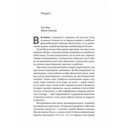 Нью-Йорк, 1944 рік. Після загибелі чоловіка в бою з нацистами, Вів’єн розпочинає власну війну: запобігає спробам впливового сенатора ввести цензуру на «Армійські видання» — кишенькові книжечки в м'якій обкладинці, які мільйонами відправляють солдатам за кордон. Вона знає, як багато вони означають для солдатів, і єдиний спосіб виграти цю битву — протиставити пропаганді сенатора власну історію — історію таємничої жінки-самітниці, яка доглядає за Американською бібліотекою заборонених книг у Брукліні.