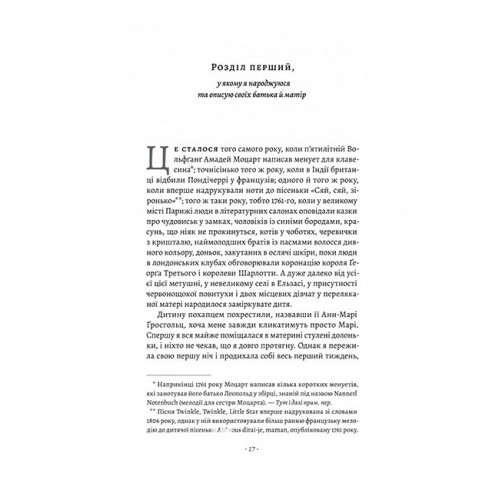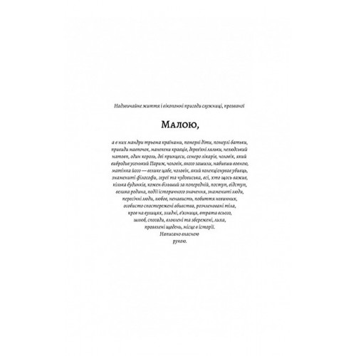 Видавництво "Лабораторія" Мала., Едвард Кері 978-617-8362-85-0 1761 рік. У швейцарському селі з'явилася на світ крихітна дівчинка на ім'я Марі, навіть не підозрюючи, які випробування підготувало їй життя. Дивна, але надзвичайно обдарована дитина, що рано втратила батьків, знайомиться із не менш ексцентричним вчителем — майстром воскових скульптур, який відкриває для неї світ паризького життя. Але в той час, коли скульптури Марі, відкривають їй двері Версалю, де вона стає наставницею принцеси і допомагає Марії-Антуанетті зберегти життя під час пологів — світ охоплює революція: натовпи стають дедалі гучнішими, вимагаючи змін... і голів.
