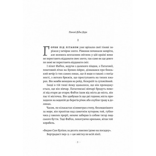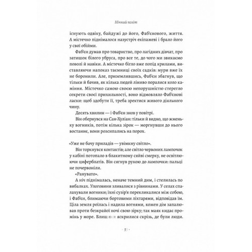 У романі «Нічний політ» автор веде нас крізь захмарну розповідь про фанатичного керівника аргентинської авіапоштової компанії Рів’єра, який лише після втрати відданого пілота-робітника приходить до усвідомлення, що любов і обов’язок у цьому світі — суперечливі, але рівноцінні.