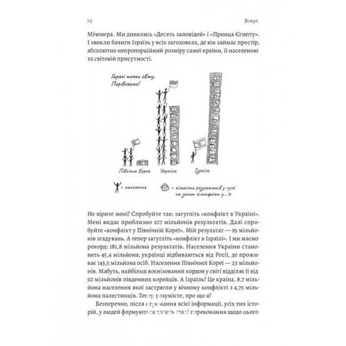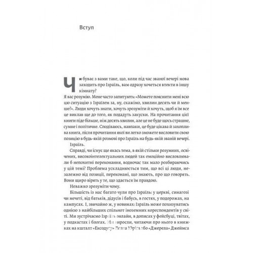 Ця книжка — спроба розповісти історію конфлікту і примирити столітню боротьбу двох народів. Автор намагається пояснити, чому Ізраїль та ізраїльсько-палестинський конфлікт викликає такі суперечливі думки. Разом із путівником, який проводить читача актуальними проблемами регіону, автор подає історичний огляд країни від біблійних часів до сьогодення.