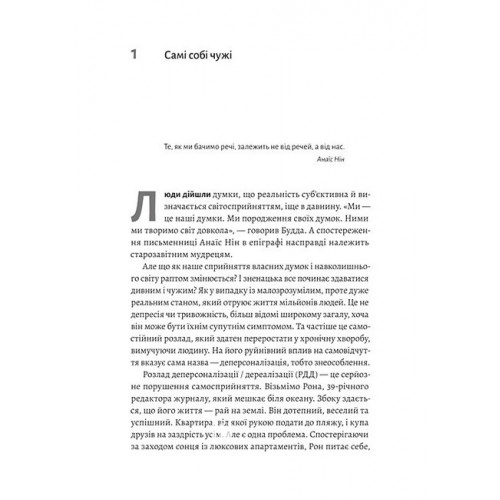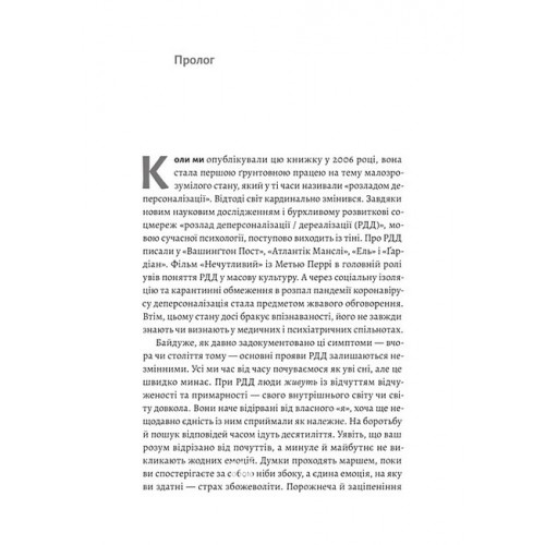 Видавництво "Лабораторія" Відчуття нереальності. Деперсоналізація та втрата власного «Я»., Дафні Сімеон, Джеффрі Еб’юґел 978-617-8299-01-9 Вперше гучного розголосу розлад деперсоналізації — відчуття втрати себе, емоцій і почуттів — набув завдяки голлівудській стрічці «Нечутливий» (Numb) із Метью Перрі в головній ролі. А завдяки новим науковим дослідженням і бурхливому розвиткові соцмереж цей маловідомий стан нарешті вийшов із тіні.