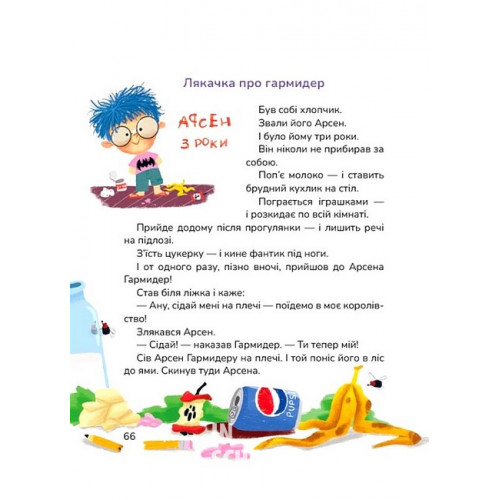 Маґура Лякачки до усміхачки., Ірен Роздобудько 978-617-8177-17-1 Якщо довго вередувати, можна отримати страшенні (аж до усміхачки!) наслідки. Наприклад, перетворитися на рибу чи восьмирука, зустрітися з велетенською булочкою і потрапити — куди? — в дітопарк. Можна навіть помалювати на шпалерах і пожити в яблуку, коли захочеться.