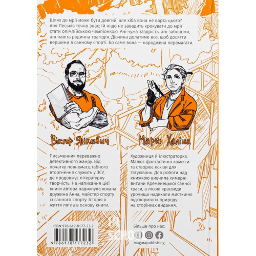 Маґура Народжена перемагати., Віктор Янкевич 978-617-8177-23-2 Шлях до мрії може бути довгий, але хіба вона не варта цього? Аня Леськів точно знає: їй ніщо не завадить крокувати до мрії стати олімпійською чемпіонкою. Ані чужа заздрість, ані заборони, ані навіть родинна трагедія. Дівчина долатиме все, щоб досягти вершини в санному спорті. Бо саме вона — народжена перемагати.