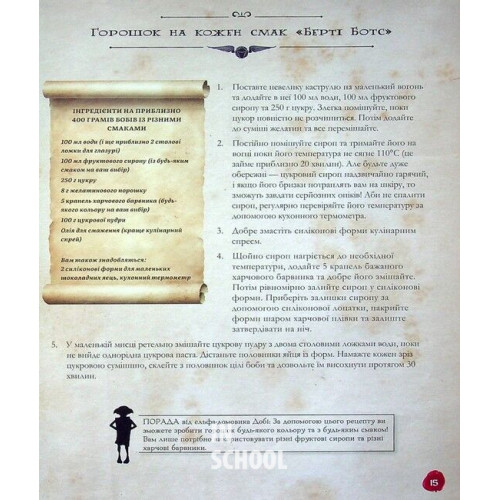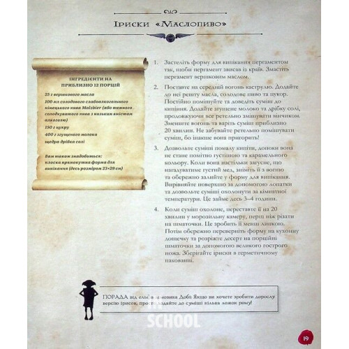 Рецепти в цій книзі, починаючи від ситної британської класики й закінчуючи витонченими витребеньками, могли з’явитися прямо з «Трьох мітел» чи хатини Геґріда. Серед них є такі ласощі, як курка з перцем, тартар з м’яса дракона, гарбузові пироги, павучі яйця, розкішний торт місіс Дурслі, тушковані баранячі відбивні, миші з морозива та яблучний штрудель. А якщо ще й запити це маслопивом, то навіть про боротьбу з Самі-Знаєте-Ким можна забути!