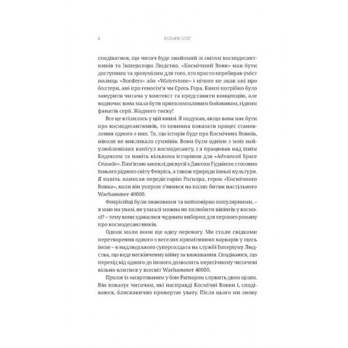 Мольфар комікс Warhammer 40.000 – Космічний вовк., Вільям Кінґ 978-617-8485-16-0 На безжалісному та смертельно небезпечному світі Фенрісі нечисленні мешканці щодня змушені протистояти смертоносним чудовиськам і нападам грабіжників. Одного дня доля молодого Раґнара з племені Громових Кулаків змінюється назавжди, коли його обирають воїном самих богів. Після порятунку від лютої смерті на бойовищі його приймають в могутню капітулу Космічних Вовків космодесанту і кидають просто в полум’я галактичної війни проти темних сил Хаосу. Однак імплантація священного геносімені вивільняє його первісні інстинкти, і Раґнарові доводиться боротися проти власного внутрішнього звіра, доки той не поглинув його остаточно.