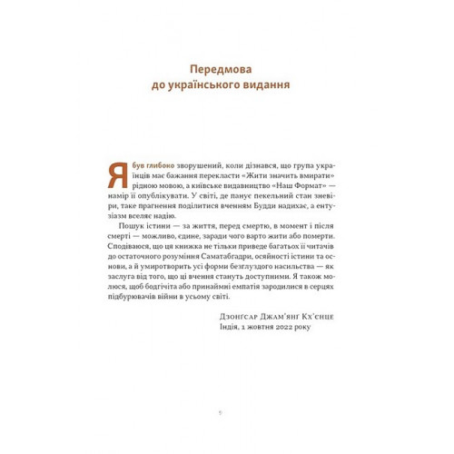 Наш Формат Жити значить вмирати. Як підготуватися до смерті, вмирання і того, що буде далі., Дзонґсар Джам'янґ Кх'єнце 978-617-8441-85-2 На тридцятому році життя принц Сіддгартха вперше в житті побачив мерця.